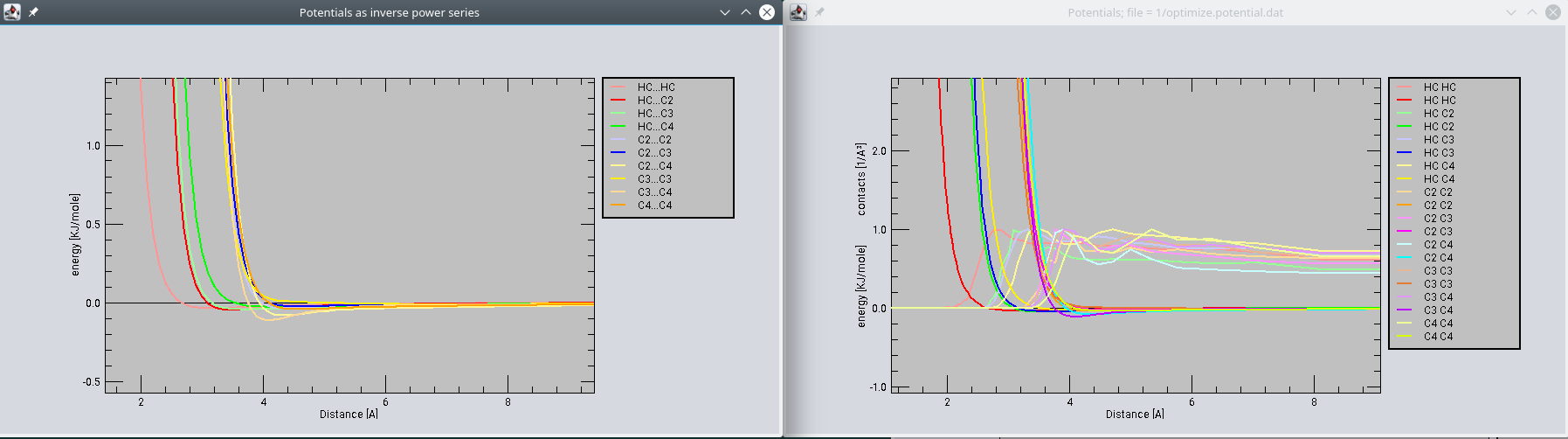 The left figure shows the result of optimization; on the right figure one can see the radial distribution functions of inter-atomic distances and initial potentials for sub-types HC, C1, C2, C3 and C4.